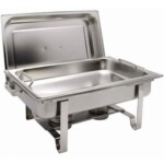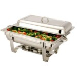 The full-size chafer is polished completely in stainless steel and provides warm food.