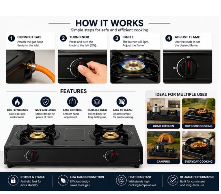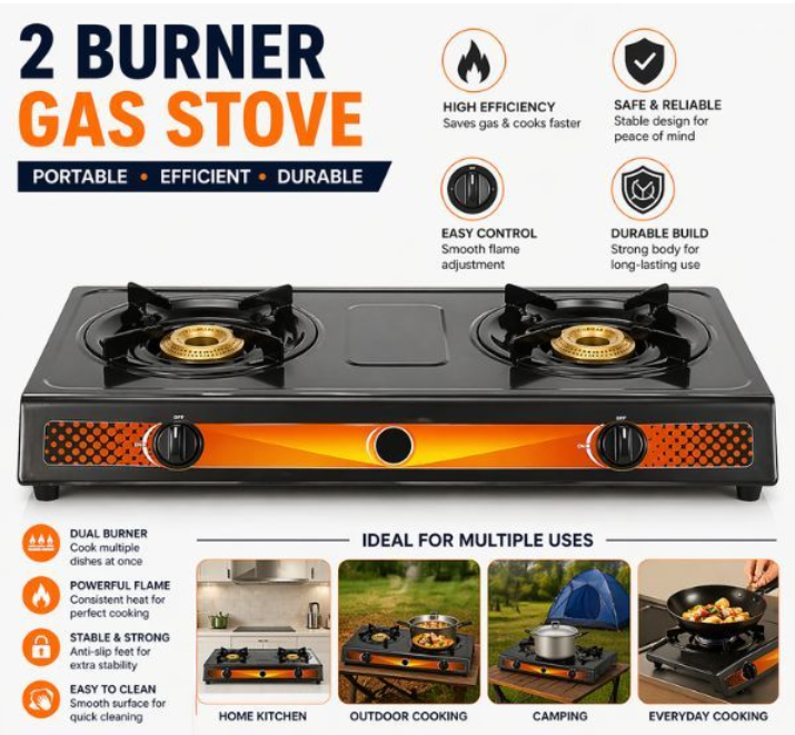 This 2 burner gas stove delivers efficient and reliable cooking performance.