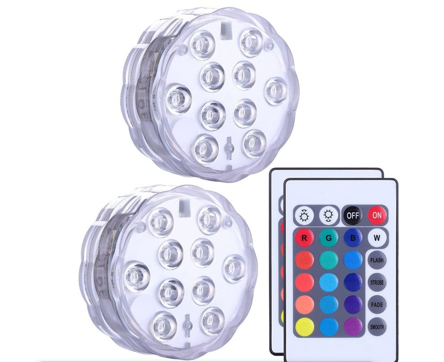 Create a stunning atmosphere anywhere with this 2 Pack Remote Control Waterproof Submersible LED Light set. Perfect for pools, fountains, fish tanks, vases, bathtubs, weddings, parties, and home décor, these compact yet powerful LED lights deliver vibrant RGB colors and eye-catching lighting effects.