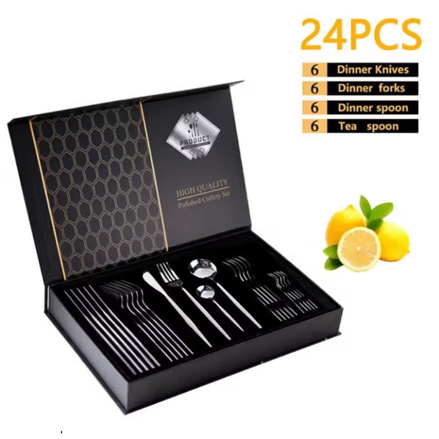 Upgrade your dining experience with this elegant 24 Piece Stainless Steel Cutlery Set, designed for everyday meals and special occasions. Crafted from high-quality stainless steel, this set offers durability, rust resistance, and long-lasting shine. With a modern, sleek finish, it complements any table setting—perfect for homes, restaurants, events, or gifting.