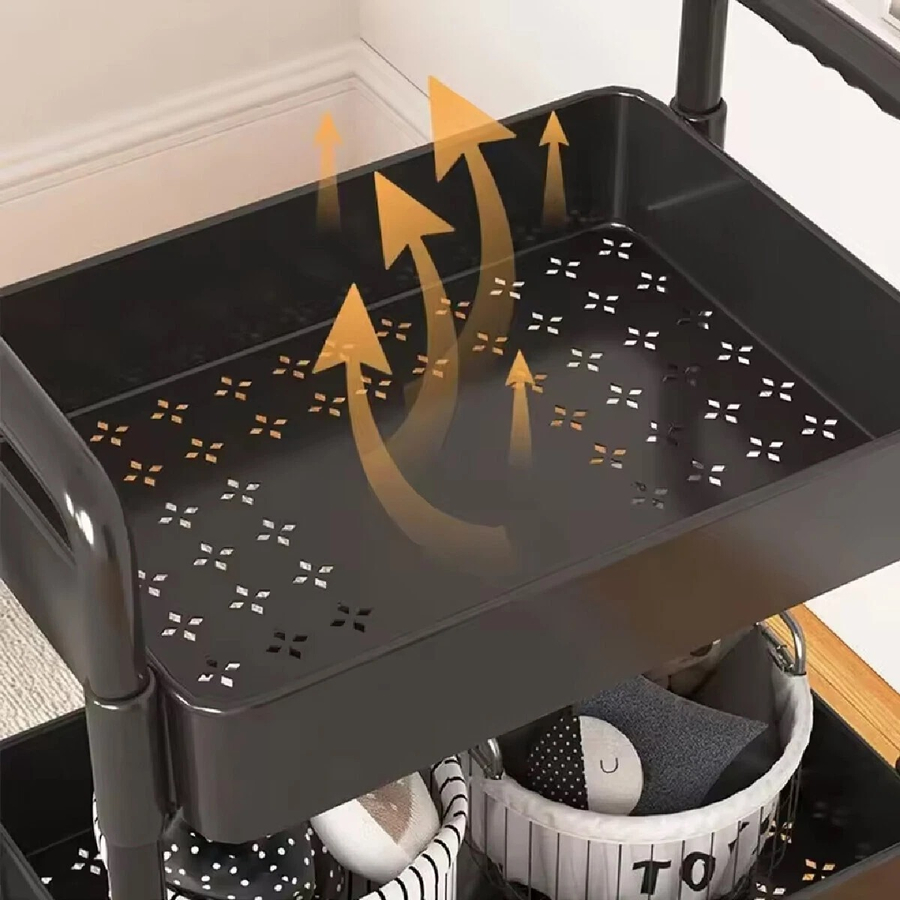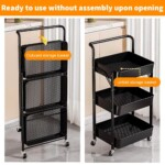 This storage cart provides sufficient space for you to organize toiletries, kitchen stuff and other daily suppliers. With four universal wheels equipped on the bottom of the utility trolley, it is to move and will be a good partner to carry items. The 3-tier utility rolling cart is made of high-quality metal frame material storage baskets which are lightweight, durable, anti-corrosion, waterproof, scratch-resistant. Thick metal frame makes it sturdy enough. This is a foldable model and available in black & white.