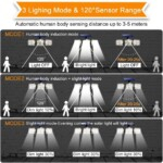 3.motion detector can detect motion within 3-5 feet at an angle of 120 degrees. It automatically shuts down during the day, and can only be turned on for 30S at night when it senses movement. When people are active in the sensor area, the light mode maintains brightness.