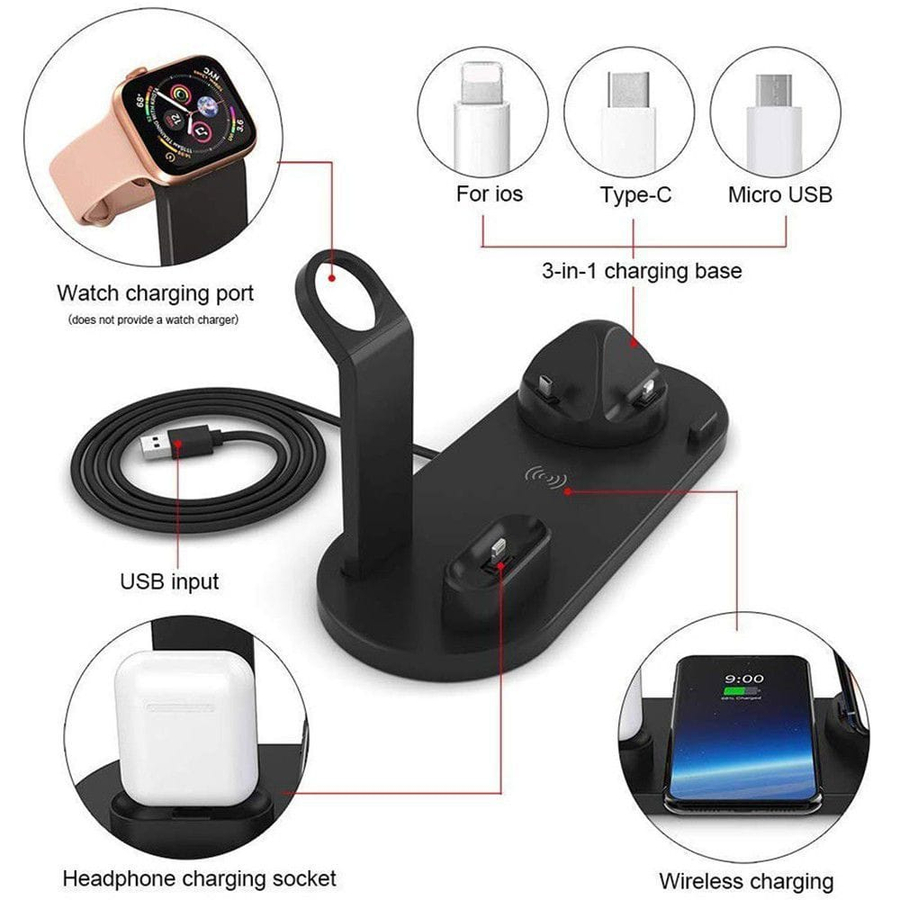 Docking Station with QI Wireless Charger – 10W Lightning, USB-C Port & MicroUSB Charging Points.