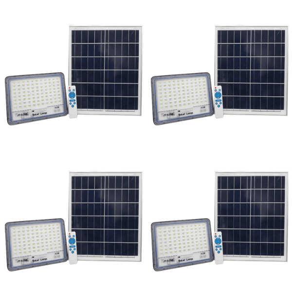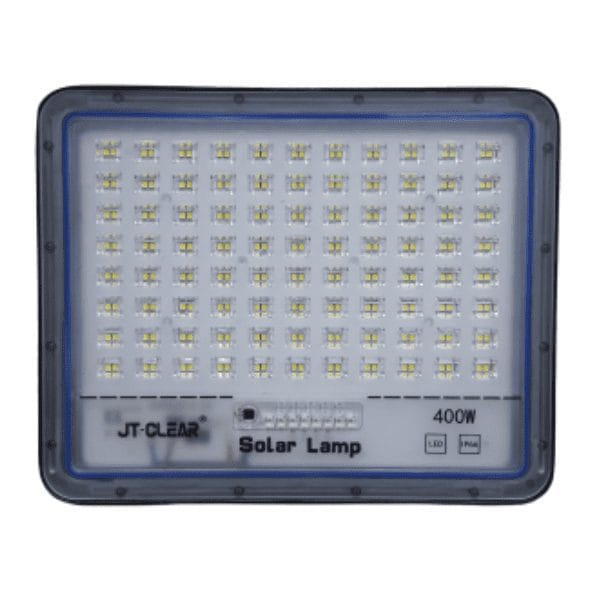 -Great Lasting Super Bright 400w Solar Flood Lamp that is easy to install (DIY) -Just Plug and Play (outdoor or can be used indoor) Parameters -Waterproof level: IP66 -The beam Angle: 100 degrees -Color Value: >70 -Color Temperature: 6500k -Adjustable Angle: Around 180 degrees Specifications The Lamp Body -The lamp body shell is made of die-cast aluminum +ABS material. The LED luminous beads make the lamp body brighter Heat dissipation -The integrated die-cast aluminum housing provides efficient heat dissipation Photovoltaic Panels -High quality crystal silicon solar photovoltaic panels, high conversion rate, fast storage of electricity The Power Interface -tight waterproof power connector to prevent leakage of equipment from damaging products Charging -Solar panels charge and store power automatically during the day when there is the sun. Automatic Night Working -When fully charged the light will automatically turn on when it gets dark. Its smart and convenient. Lamp Body size: 26cm x 20cm x 5.8cm Solar Panel Body size: 35cm x 42.5cm x 1.6cm Solar Panel Specifications -Pmax: 25W -Vmp: 6v -Imp: 4.16A -Voc: 7.2V -Isc: 4.9A -Maximum System Voltage: 100v Whats in the Packaging 4 x 400w JT-Clear Solar Flood Lamp 4 x Remote Control 4 x Set of Mounting Screes 8 x AAA Batteries 4 x Solar Panel