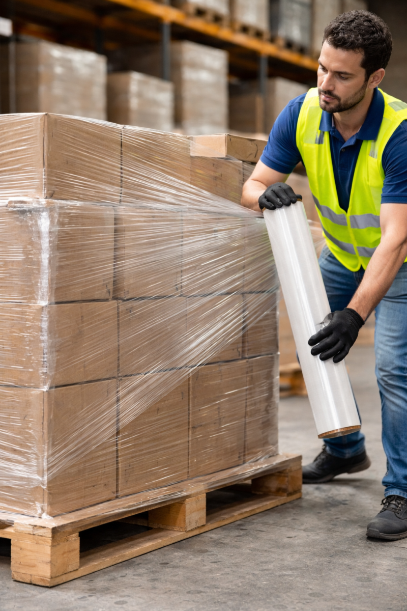 Highly stretchable plastic film typically made from linear low‑density polyethylene (LLDPE) designed to secure and stabilize goods on a pallet, preventing load shifting, dust ingress, or moisture exposure during storage and transport. The film’s elasticity ensures tight clinging to itself without adhesive, forming a protective barrier that keeps packaging compact and intact.