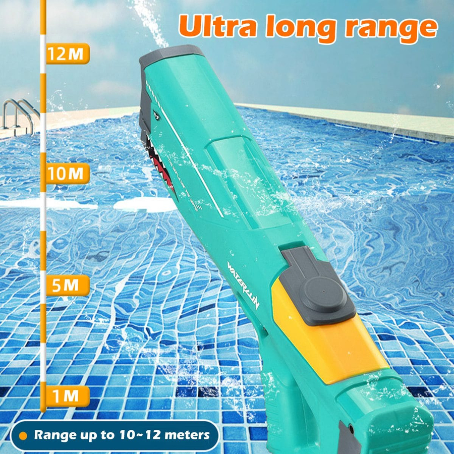 Large Capacity and Long Range This water pistol can hold 500ml of water and has a range of 39 feet, use the screwdriver provided to tighten the battery cover for effective battery protection. Be careful not to submerge the automatic water pistol completely in water, otherwise it will damage the electrical parts. 550ml Electric Water Gun Turquoise