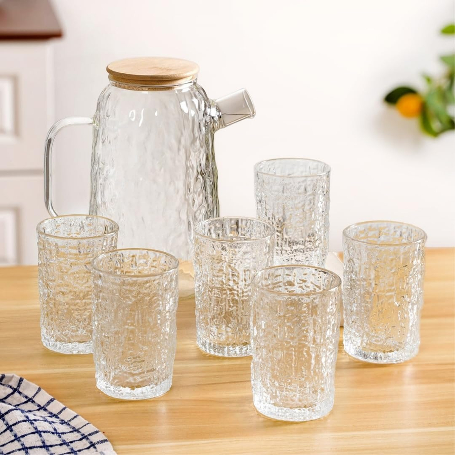 7-Piece Textured Glass Water Jug & Tumbler Set with Wooden Lid