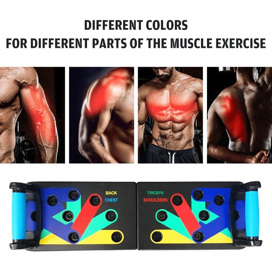 Different colors on the push up board targest specific muscle groups (Yellow-Back, Purple-Chest, Green-Triceps, and Red-Shoulders)