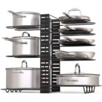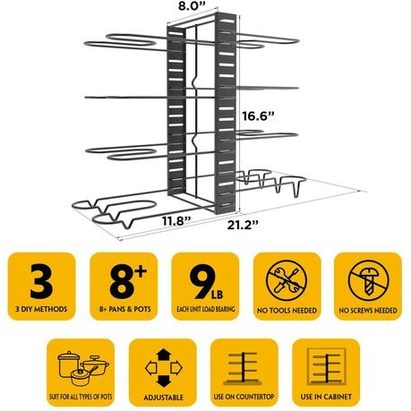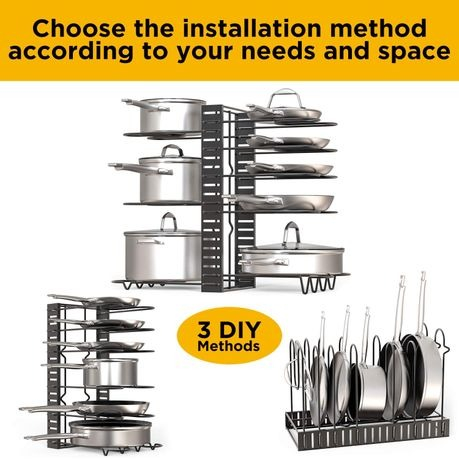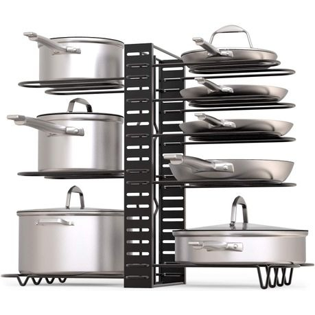 8 Adjustable Racks: Customize spacing to fit pots, pans, lids, or baking trays of varying sizes.