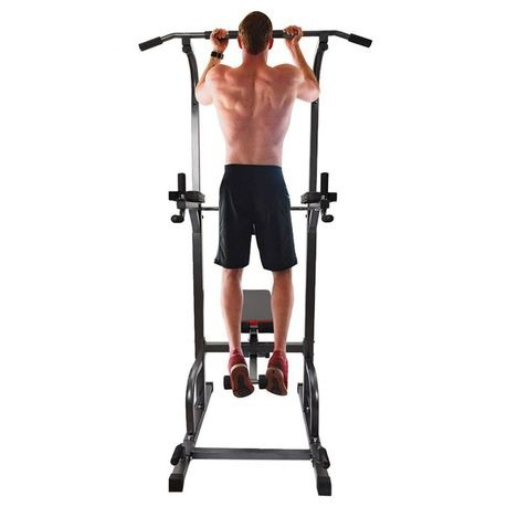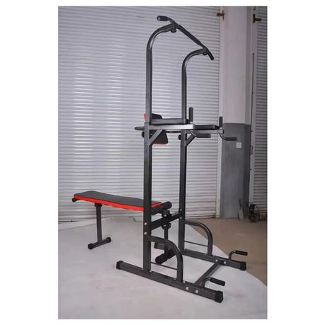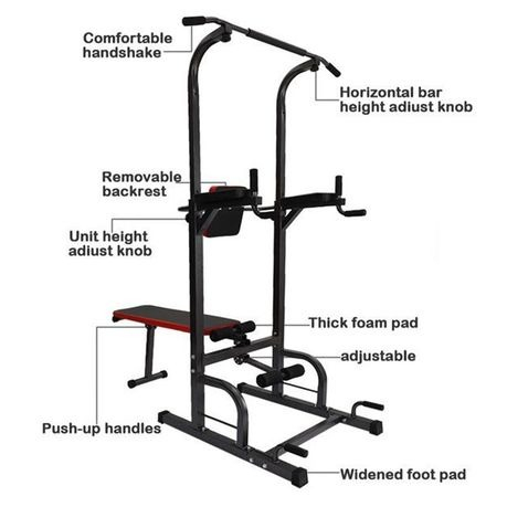 Upgrade your home workouts with the Adjustable All-In-One Pull-Up Bar Tower Dip Station with Foldable Bench Bar. This versatile fitness equipment allows you to perform pull-ups, dips, push-ups, leg raises, and bench presses in one compact setup. Its sturdy steel frame and foldable bench bar provide a safe and durable platform for full-body strength training, making it ideal for home gyms or small workout spaces.