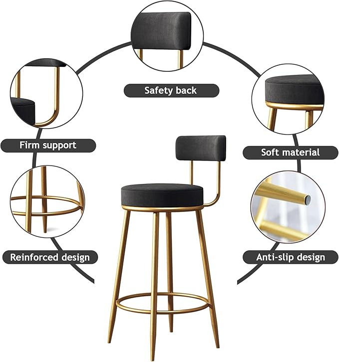 The arched design with high backrest, the ergonomically curved shape is perfectly adapted to the shape of the body, provides good relaxation after prolonged sitting, and saves from fatigue. The bar stool is made of high-quality velvet fabric, great touch and texture, skin-friendly, durable, flexible, not wrinkled. Modern style and padded dining chair provide a comfortable and enjoyable using experience. Features with high-quality metal frames and 4 strong legs, there is a footrest on the base, it not only supports your feet well, but also makes this stool more stability. In addition, our bar stool Legs with floor protectors to prevent scratches on your floor. The bar stools are suitable for bars, countertop, kitchen island, dining room, coffee room, rest room, pub, farm, restaurant, salon, entertainment centers and office, and bring you more convenience and comfortable experience.