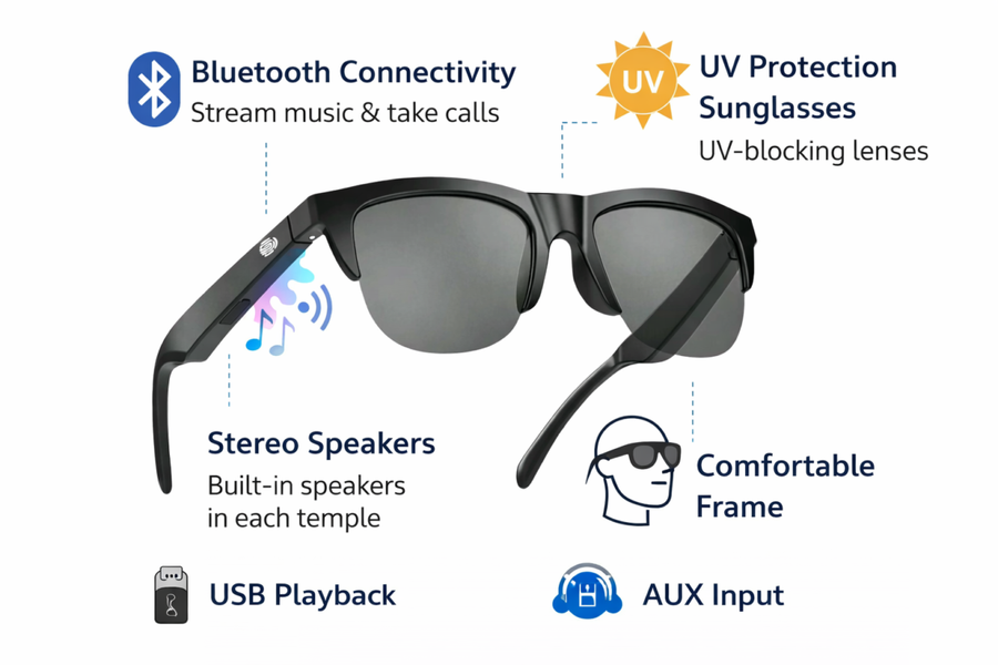 Enjoy music and take calls without wearing traditional earphones. These Bluetooth Glasses Wireless Headset combine stylish sunglasses with built-in wireless speakers and a microphone for hands-free convenience.