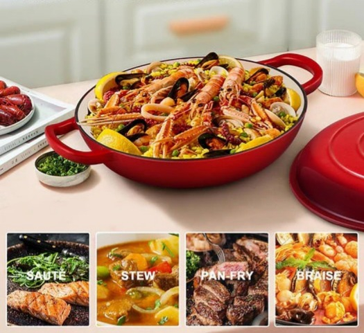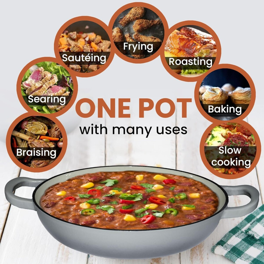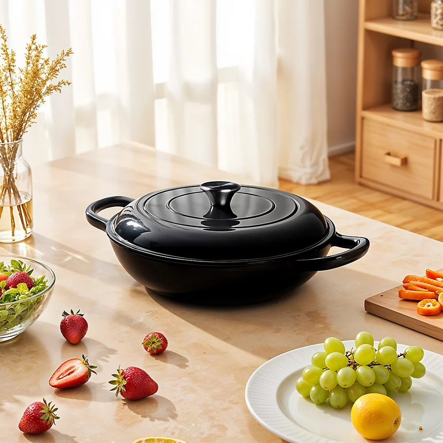 Cast iron shallow casserole designed for versatile cooking from stovetop to oven and table-to-serve use. Built with a wide, shallow base to ensure even heat distribution and superior flavor retention, this casserole is perfect for searing, braising, roasting, simmering and everyday meals. Its classic enamel-coated finish adds durability and a timeless kitchen aesthetic.
