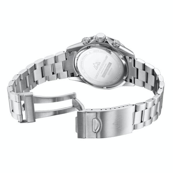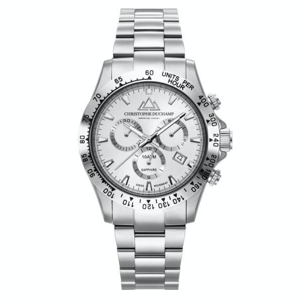 Case Material Stainless Steel Strap Material Stainless Steel Case width including crown 45.7mm Case Depth 10.4mm Case diameter 36.0mm Movement Swiss Quartz Weight 142g Water Resistant 100 Metres Function Chronograph Dial Colour Silver Case Colour Silver Strap Colour Silver Clasp Type Solid Buckle Glass Sapphire Crystal Finish Partially Brushed