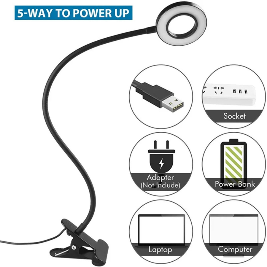 Illuminate your workspace with this versatile Table Desk Lamp with Clamp. Designed for desks, bedside tables, or study areas, it features a convenient clip-on design that attaches securely to most surfaces. The lamp is USB powered for easy connection to laptops, power banks, or adapters, and offers three color modes—warm, cool, and natural light—to suit reading, studying, or relaxing. Its flexible neck allows precise light positioning, making it both practical and stylish for any home, office, or dorm room.