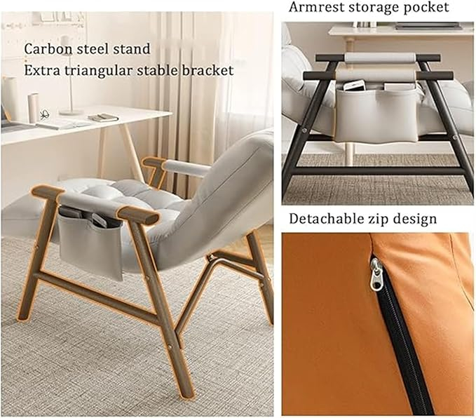 This lounge chair features a 5-position adjustable footrest and backrest, made with a carbon steel frame that is resistant to rust and corrosion. The sturdy triangular structure offers comfortable seating for any room in your home. Designed for ultimate relaxation, this well-padded chair has the perfect seat angle and ergonomic support for your comfort. The armrests provide additional posture support, while the tight-fit design and ergonomic angle ensure a relaxing experience. Crafted with a carbon steel frame and high resilience cotton padding, this chair offers durability and comfort. The washable technical fabric adds to its unique aesthetic. This mid-century modern accent chair is perfect for any room, adding a touch of style to your space. Easy assembly is required, with all instructions and tools included. The chair also features armrests with storage pockets for added convenience.