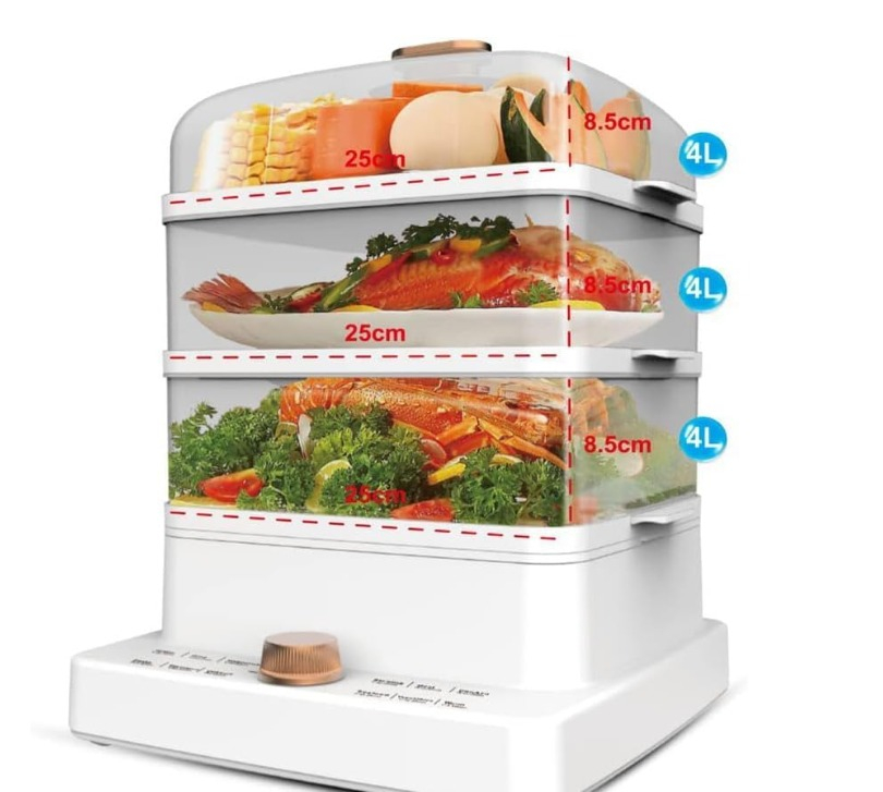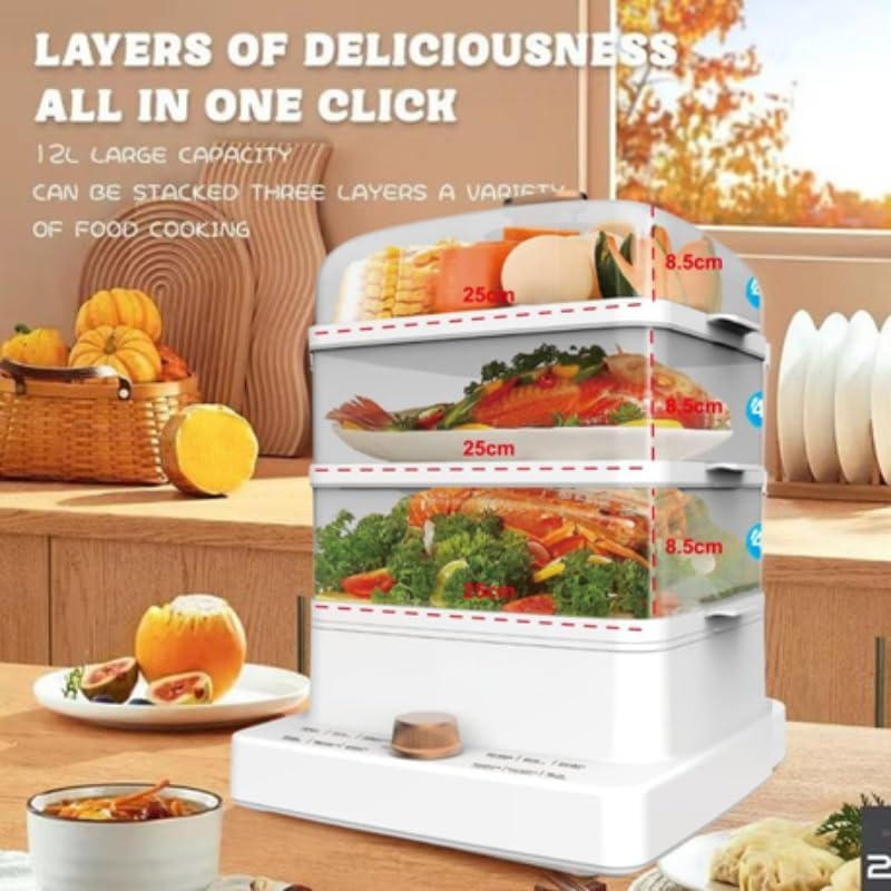 Prepare healthy, flavorful meals with ease using the 3-Tier Electric Food Steamer. Designed for modern kitchens, this powerful steamer produces rapid steam in just 10 seconds and features 12 preset cooking modes for vegetables, meat, fish, dumplings, eggs, and more. The multi-layer design allows you to cook different foods simultaneously without mixing flavors, saving time and energy. Its easy-clean split body ensures hassle-free washing, while the transparent tiers let you monitor food as it cooks. Ideal for healthy, oil-free cooking for the whole family.