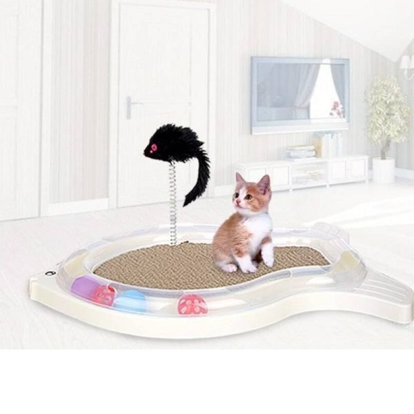 The Fish Shaped Cat Scratch Board with Spring Rat and Rolling Balls is a fun and interactive way to keep your cat entertained while protecting your furniture from claws.