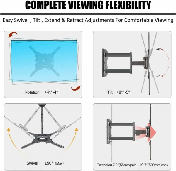 -Customize Viewing: Articulating TV wall mount bracket allows +5° and -8° tilt to reduce glare, 90° swivel (maximum swivel angle depends on your TV) to optimize viewing angles, +/-4° post-installation TV leveling, and 1.77″ to 18.89″ arm extension for flexible movement and adjustment