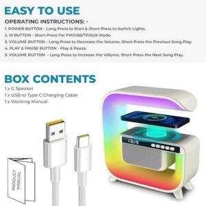G-type night light has six light color modes. After turning on the Bluetooth mode, the mode can be adjusted by pressing the key, and it will also beat with the music rhythm. Adjust your mood better, and the soft light can accompany you to sleep. Music sync RGB light: You can use the product in a bedroom gaming room desk or bedside light, it has 7 lighting modes and can combine different environment lights. (include music sync mode) G Shape LED Clock 15W Wireless Charging Ambient RGB Multicolor Speaker
