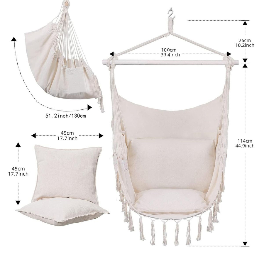 Relax in style with the Hammock Hanging Rope Chair, designed for both indoor and outdoor comfort. Crafted from durable woven cotton rope with a reinforced wooden spreader bar, this swing chair provides excellent support while creating a soothing, suspended seating experience. The breathable fabric ensures comfort in any season, while the included pillows offer extra cushioning for enhanced relaxation. Ideal for patios, gardens, balconies, lounges, or reading corners, this versatile hanging chair brings a cozy and modern touch to any space.