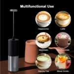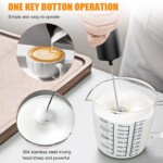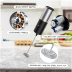 -Make Rich Foam In Seconds: Simple one-touch handheld milk frother creates creamy foam in 15-20 seconds. Just press the power button once to start frothing without the need to hold the button down; Relax your hand, enjoy the baristas moments, and press the button again when the foam reaches your favorite consistency. -High Quality & Portable: The milk frother is built of rust-resistant stainless steel for long-lasting. A Powerful motor produces very little noise while in use. The portable size is convenient to carry, making sure you can enjoy your morning coffee while traveling. -Easy to Clean and Use: To clean, just put the handheld Electric Stirrer in water and press the button to spin it clean. Please note that the body of the milk frother is not waterproof, so please do not immerse it in water. To Use, just put it into a container with liquid, and it will start working immediately. The rod does not wobble while it works and stays balanced at all times. -Battery Operated: It is powered by two AA batteries(2AA not included). So you don’t have to worry about cords and finding sockets. Very convenient for home travel and office use. -Multi-purpose Use for a Better Life: You can enjoy all kinds of coffee drinks, whether you love lattes, cappuccino, hot chocolate, macchiato, or mocha. With this automatic battery-operated milk frother, you ll be able to appreciate the delicious aromas of your favorite coffee drinks truly. Handheld Battery Operated Milk Froather