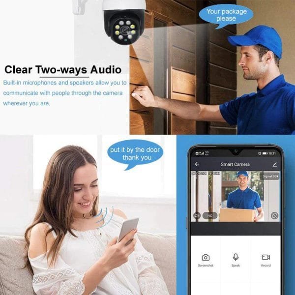 – People near the camera via the app and scare off intruders. It supports motion detection or human sound or sound detection alarm mode to avoid false alarms like passers-by street or leaves moving in your yard.