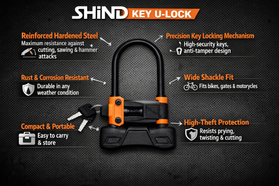 Secure your bike, gate, or motorcycle with this heavy-duty key U-lock. Constructed from hardened steel, it offers maximum protection against theft and tampering. The compact yet robust design is ideal for both urban and outdoor use. Comes with a smooth-turn key locking mechanism for reliable, easy operation. Perfect for cyclists, motorcyclists, and property security.