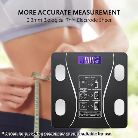 Track your health and wellness with precision using this Home Bathroom Bluetooth Body Scale. Designed for everyday use, it not only measures your weight but also syncs wirelessly with your smartphone via Bluetooth to record, monitor, and analyze your progress over time. Its sleek tempered glass surface and modern design make it a stylish addition to any bathroom while providing accurate, reliable readings.