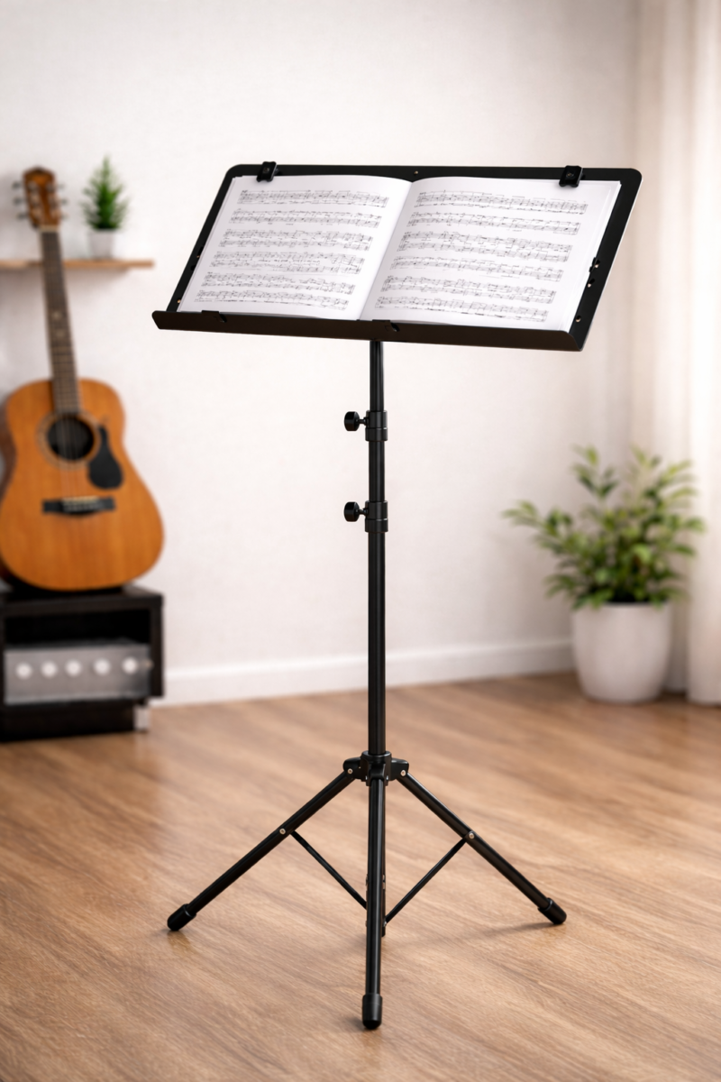 Height‑adjustable, portable stand engineered to support multiple sheets of music, large music books, scores, or binders for musicians of all skill levels — from beginners to professionals. These stands typically feature a wide desk/tabletop which provides ample space for extended scores or multiple pages side‑by‑side, and an adjustable tripod or telescoping shaft that lets players perform comfortably while seated or standing. Durable metal construction and foldable design make them ideal for use in rehearsals, practice spaces, classrooms, band rooms, or stage performances.