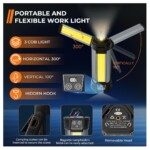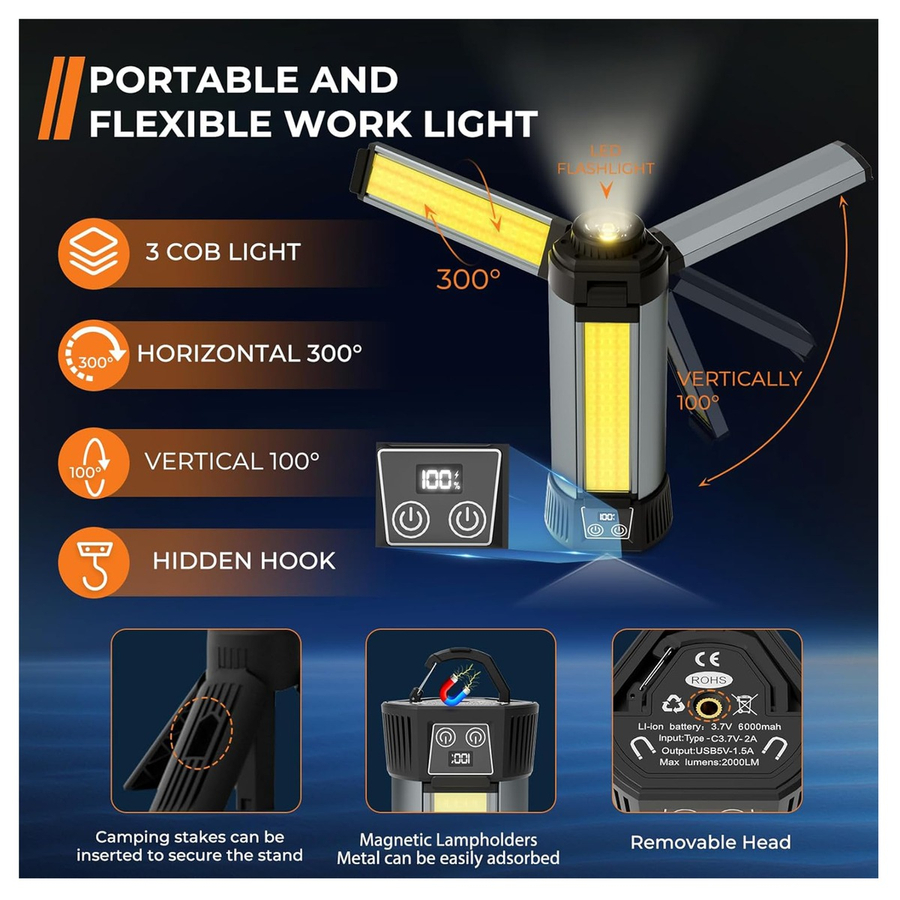 Provides bright and reliable illumination for construction sites, workshops, garages, and outdoor activities. Designed with a durable frame and adjustable folding stand, it allows flexible positioning for optimal lighting. The high-brightness LED technology delivers powerful 2000-lumen output while remaining energy efficient. Its portable and sturdy design makes it ideal for professional and home use.