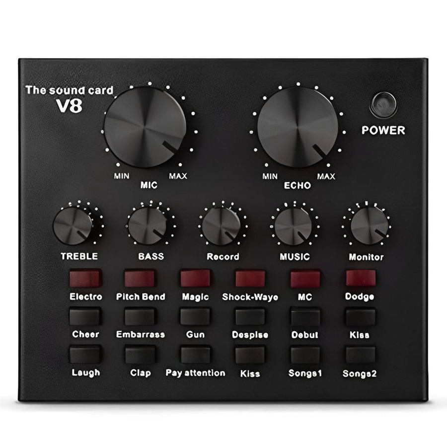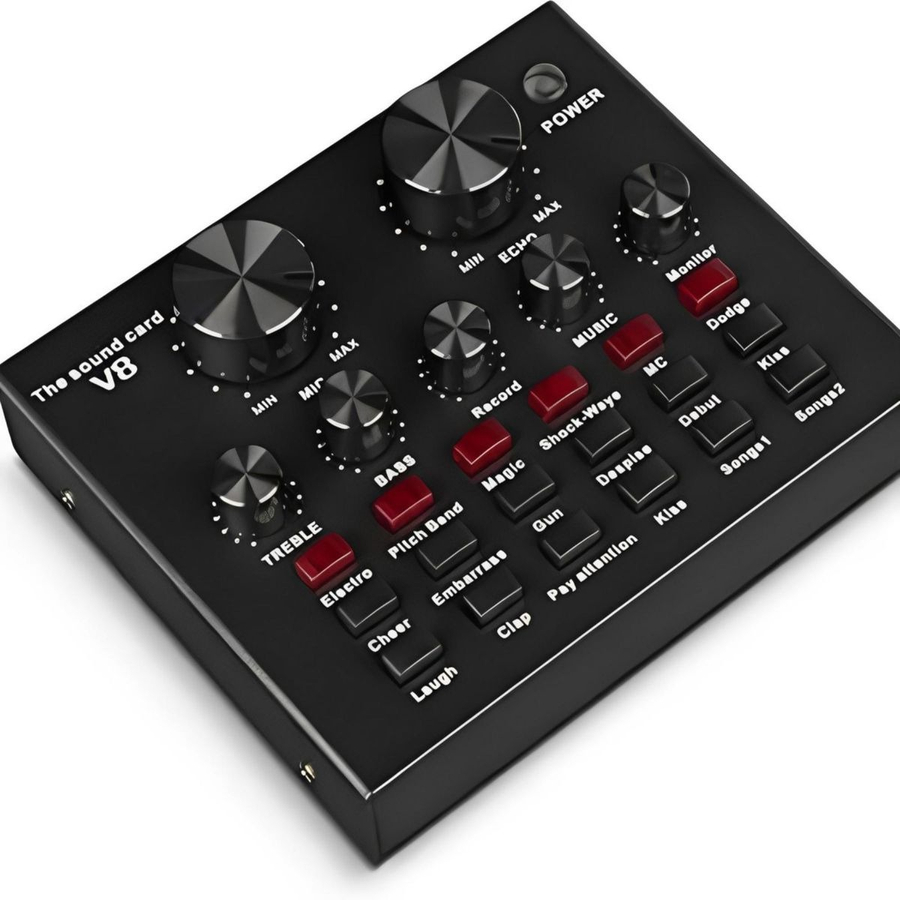 Upgrade your audio setup with the Microphone Kit with V8 Sound Card Studio Condenser, perfect for streaming, podcasting, recording, and online communication. This all-in-one kit includes a high-sensitivity condenser microphone for clear, crisp sound capture, paired with the V8 sound card for real-time audio effects, voice modulation, and background noise reduction. Designed for professional-quality sound in a compact, easy-to-use setup, this kit is ideal for home studios, content creators, and online broadcasters.