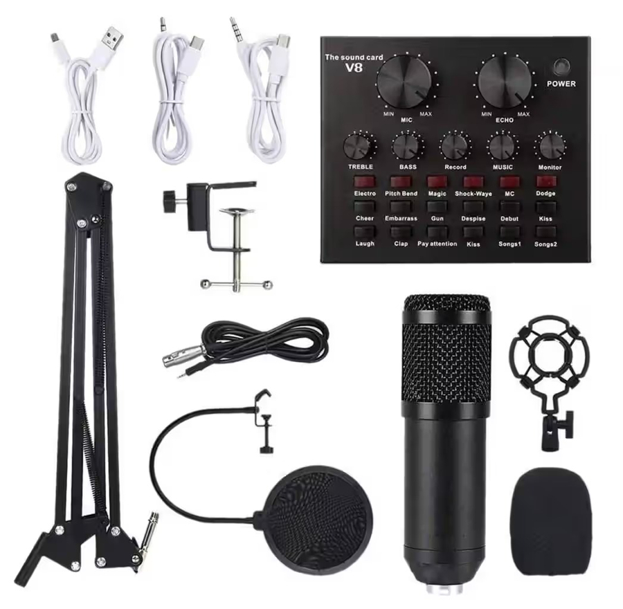 This complete recording kit features a high-quality studio condenser microphone paired with a V8 sound card, delivering professional-grade audio for streaming, podcasting, singing, gaming, and online teaching. The kit provides crystal-clear sound, multiple voice effects, and easy connectivity to PCs, laptops, and mobile devices. Its user-friendly design ensures quick setup, while the durable build and sleek black finish make it a reliable choice for home studios and content creators.