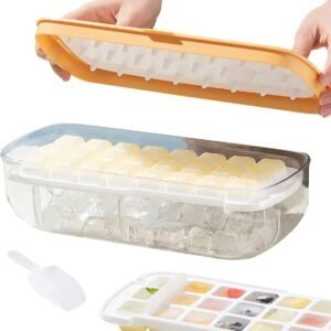 Food Grade Safe Material: Made of BPA-Free and Premium plastic, our silicone ice tray for freezer with lid and bin is safety and durable and reusable. Each tray makes 32 nice-sized cubes for a total of 64. The ice cubes are perfect for whiskey, cocktails, smoothie, juices, or other mixed drinks. You can also fill fruits, jelly, baby food, coffee, vegetable puree, yogurt and chocolate into molds. Rinsed with running water for easy cleaning.
