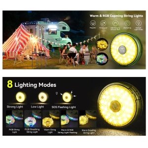 Strong Light, Low Light, SOS Flashing Light; String light for 5 modes: RGB String Light, RGB String Light, Warm String Light, Warm & RGB String Light Flashing, Warm String Light. Multi-mode and multifunctional, it can not only be used as an atmosphere light string, but also as a flashlight, camping light, and night light, with extremely high practicality.