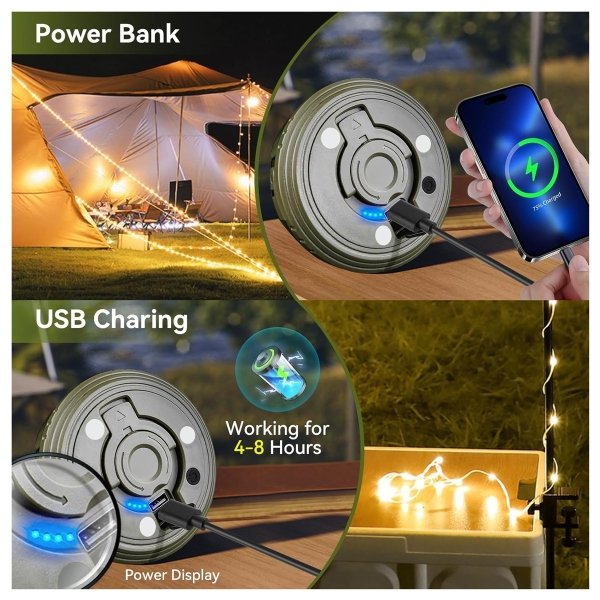 The upgraded camping light string comes with a built-in 2000mAh battery and comes with a USB charging cable. It has two charging ports, Type C and USB, and can work for 5 hours when fully charged. The blue battery indicator on the back of the lamp provides a more intuitive view of the battery level, allowing for early charging in case of running out of battery and responding to unexpected situations.