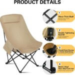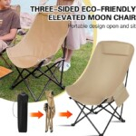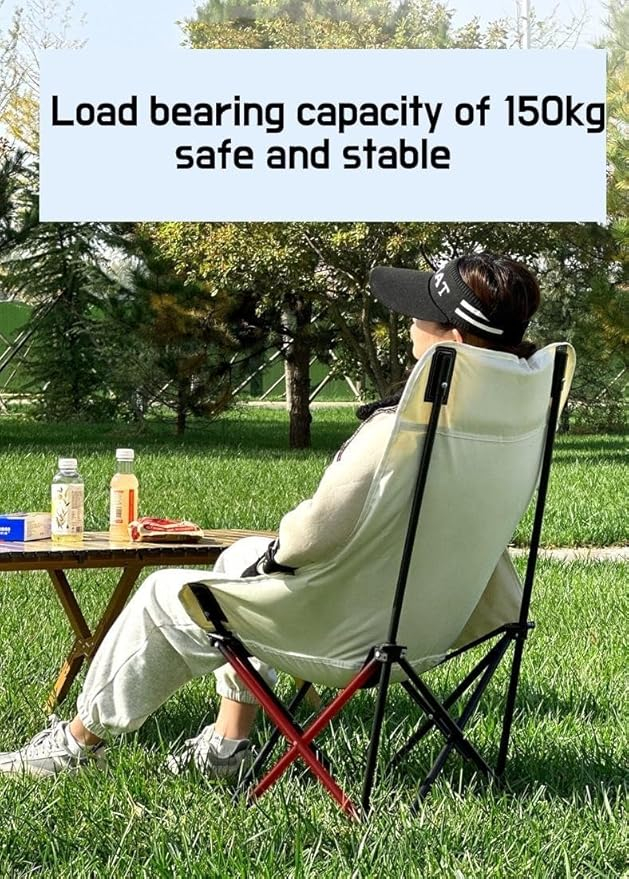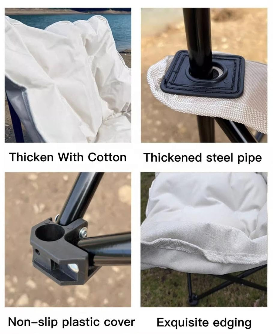 High-back moon chair design with curved contours provides exceptional comfort and support for extended outdoor relaxation. Includes carrying bag and folds compactly for easy transport, perfect for camping, festivals, and outdoor events. Durable Construction Strong steel frame with heavy-duty khaki fabric ensures stability and longevity for outdoor use. Smart Storage Built-in side pocket keeps mobile phones and small essentials within easy reach while seated. Versatile Use Ideal for camping, garden, beach, or patio settings, with sturdy construction supporting comfortable seating.