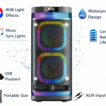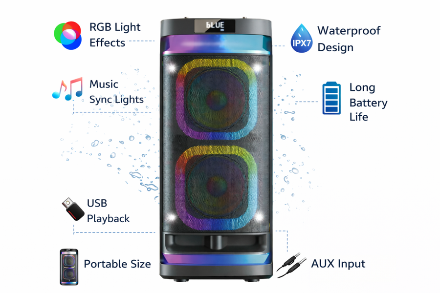 A versatile Outdoor Bluetooth Party Speaker with dynamic RGB LED lighting that pulses and changes in sync with your music. Designed for outdoor gatherings, picnics, beach parties, backyard BBQs, and more, this speaker streams wirelessly from your smartphone, tablet, or laptop — and its multicolored lights create a lively, festive atmosphere.