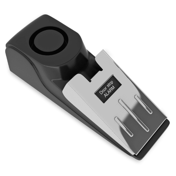 Portable Alarm Door Stopper Description: A portable alarm door stopper is a small, battery-operated device designed to enhance the security of a room or space. It typically consists of a wedge-shaped stopper that is placed under the door to prevent it from opening, and a built-in alarm that is activated if the door is forced or opened. The alarm is usually loud enough to alert people nearby and deter intruders. Portable alarm door stoppers are lightweight and easy to carry, making them ideal for travel or temporary use in shared living spaces such as hotels or dormitories. Features: – Wedge-shaped stopper: This is placed under the door to prevent it from opening. – Alarm: A built-in alarm is activated if the door is forced or opened, usually emitting a loud sound that can be heard from a distance. – Battery-operated: The device is powered by a 9V battery (not included), which makes it portable and easy to use. – Lightweight: The stopper is usually made of lightweight materials, making it easy to carry and transport. – Easy to use: The stopper is easy to install and can be used by anyone. – Versatile: The device can be used in a variety of settings, including hotels, dormitories, apartments, and other shared living spaces. What is in the box: 1 x Alarm Door Stopper
