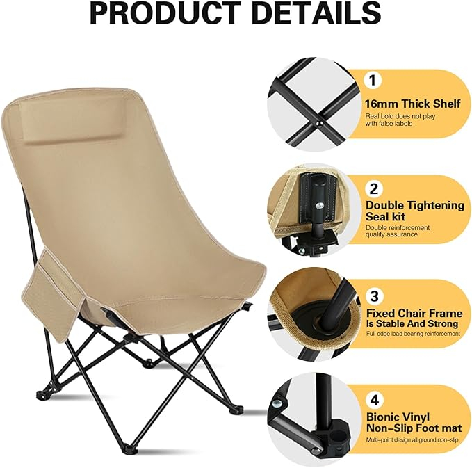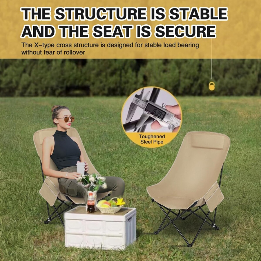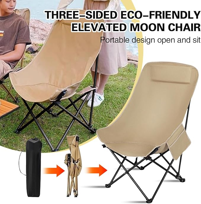 The backrest of the camping chair is made of tear-resistant, breathable, odorless, and wear-resistant nylon fabric, ensuring that even after prolonged sitting, you will not feel stuffy. Not only is it comfortable, but it is also easy to clean.This folding moon chair is ready for immediate use upon unfolding, eliminating the need for installation. Additionally, the chair is equipped with side pockets that offer convenient storage space for small items such as smartphones, sunscreen, or snacks.This Folding camping chair is not only suitable for camping, holiday outing, fishing, lawn, concert, queue and other outdoor activities, but also for daily life. With this portable Outdoor Beach Chair, you can spend quality time with your friends and family.