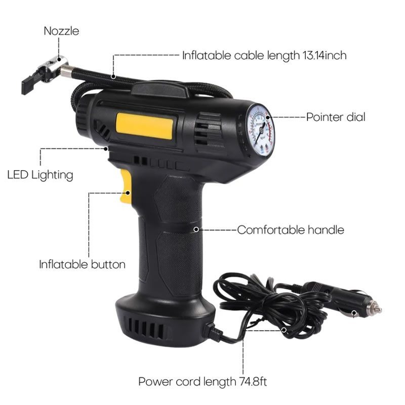 The Portable Mini Electric Tire Inflator is a reliable and compact solution for inflating car tyres and inflatables wherever you are. Engineered for convenience and performance, this portable handheld inflator delivers fast and accurate inflation with easy-to-read digital pressure guidance. Its ergonomic design and lightweight build make it ideal for keeping in your vehicle, garage, or on trips — helping you quickly restore proper tyre pressure for safer driving. Perfect for cars, bikes, motorcycles, sports balls, and more.
