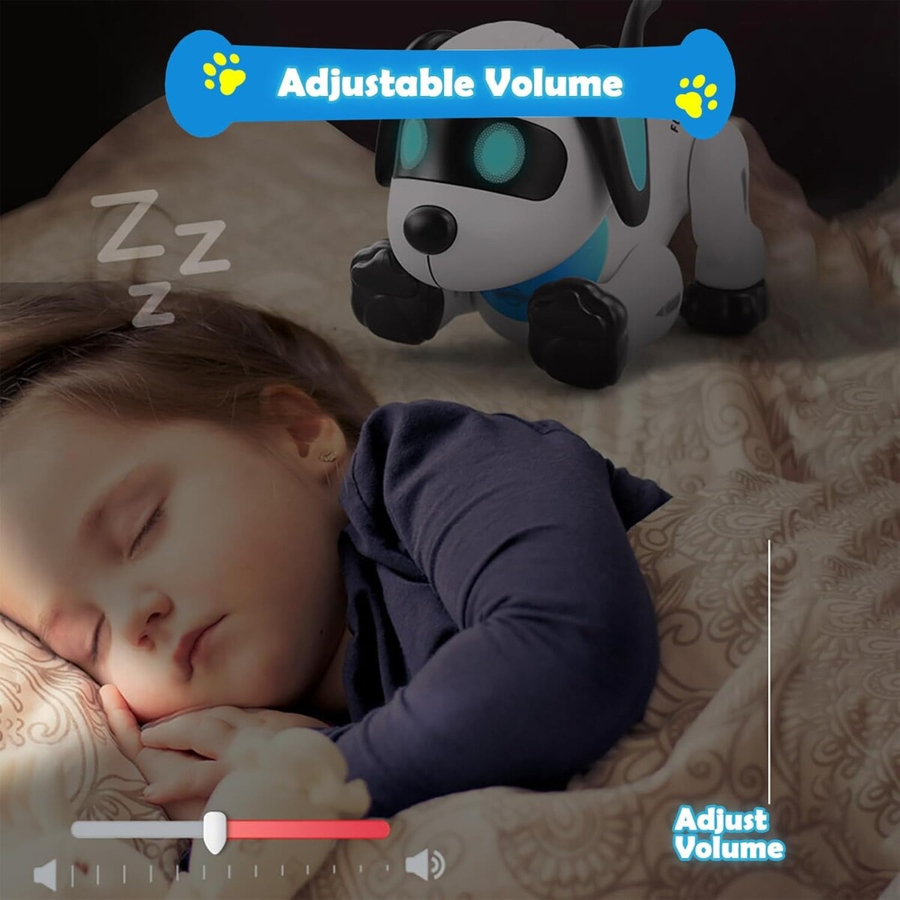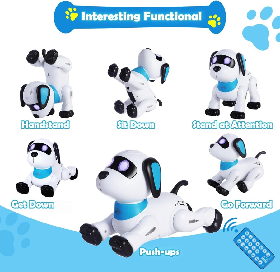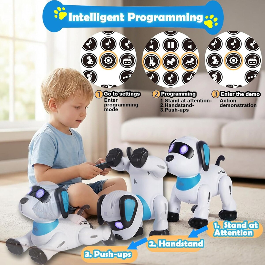 The Remote Control Robot Dog Toy is a fun and interactive electronic pet designed for kids aged 3 years and above. This smart robot dog can be controlled with a remote and features programmable actions, allowing children to create and play back exciting movement sequences. It performs lively stunts such as walking, dancing, sitting, and spinning, while bright LED eyes, cheerful sounds, and music make playtime more engaging and entertaining. Built with durable, child-safe materials, the robot dog encourages creativity, imagination, and early learning through interactive play. With its cute design and easy-to-use controls, this electronic pet toy makes an ideal gift for boys and girls for birthdays, holidays, or everyday fun.