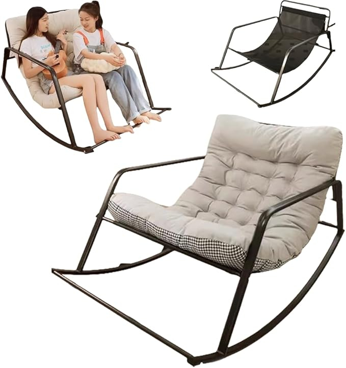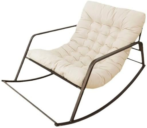Featuring durable, high quality powder-coated steel hardware and an iron frame, the ergonomic design fits comfortably in your sitting position. Steel legs are curved for easy rocking. Upholstered comfy rocking chair with removable upholstery cushions and fixed strap.