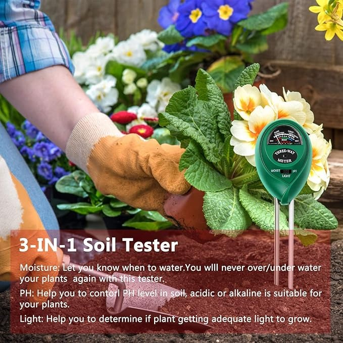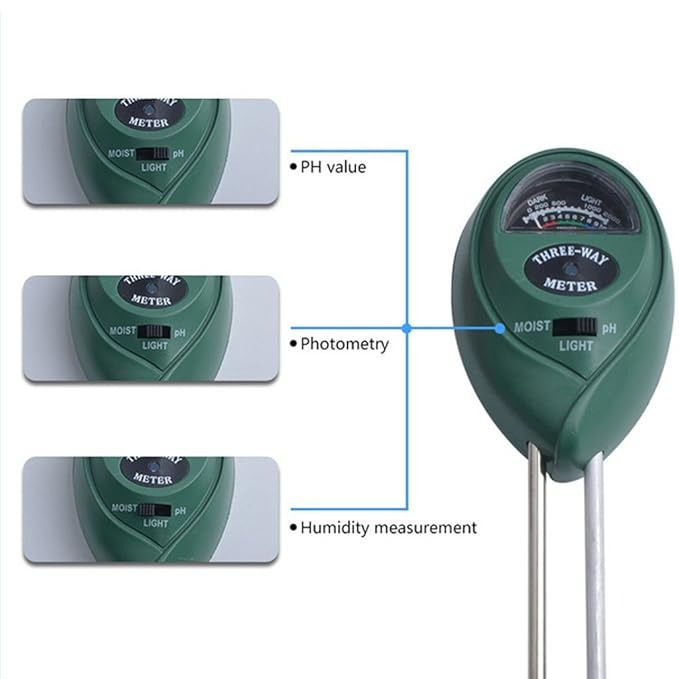 3-in-1 Functionality – Measures soil pH, moisture content, and sunlight intensity.