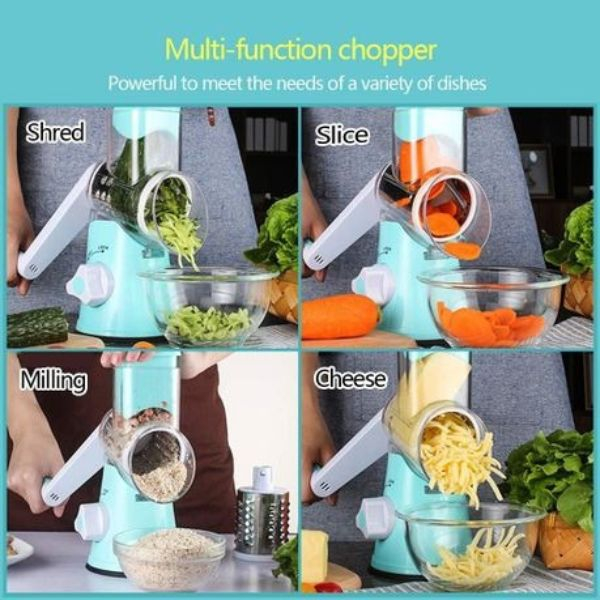 3-in-1 multifunction design – slice, shred, and grate with interchangeable drum blades.