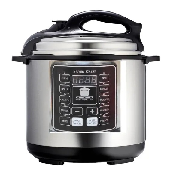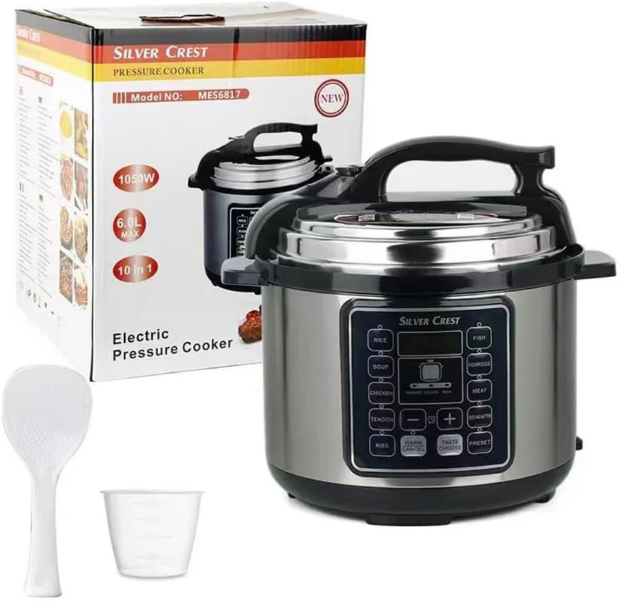 Simplify your cooking with the Silver Crest 6L Electric Pressure Cooker. With 1050W power and a 10-in-1 multi-function design, it allows you to pressure cook, slow cook, sauté, steam, bake, and more, all in one appliance. The digital control panel offers easy program selection and precise cooking, while the large 6L capacity makes it perfect for families or meal prepping. Built for convenience, safety, and efficiency, this cooker saves time in the kitchen while delivering delicious, evenly cooked meals every time.