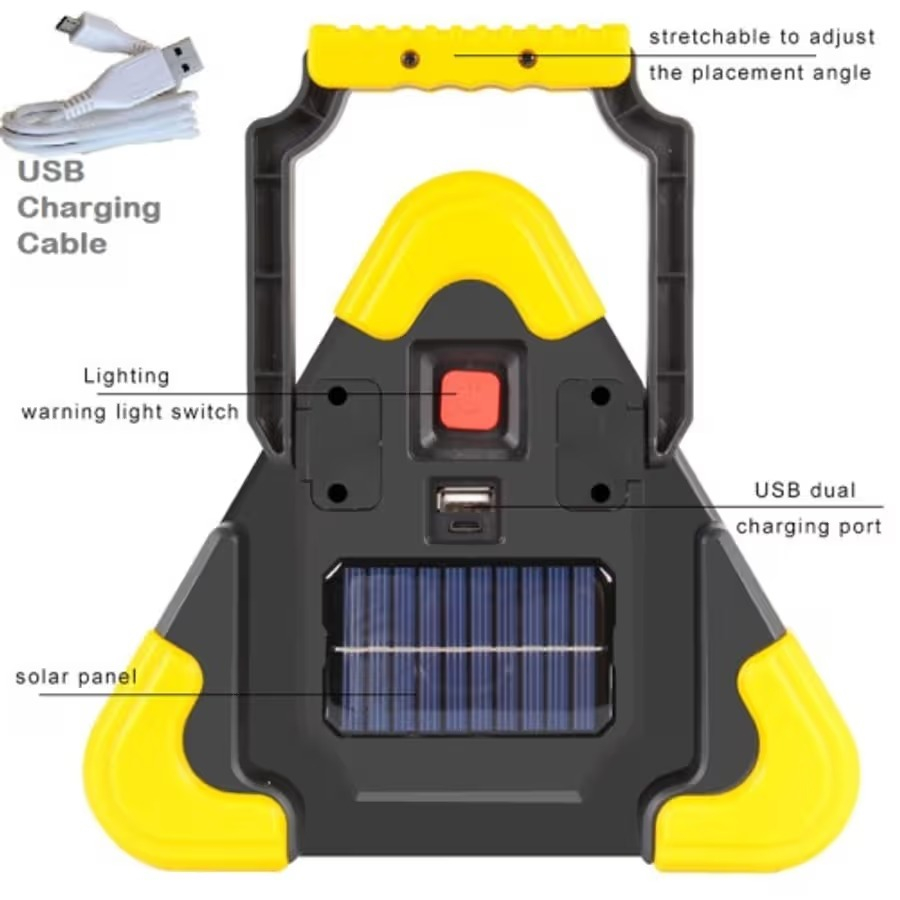 A powerful and versatile lighting solution designed for outdoor work, construction sites, and emergency situations. This solar-powered LED flood light provides bright, wide-angle illumination while being energy-efficient and environmentally friendly. Equipped with a rechargeable battery charged via solar panels or USB, it ensures reliable performance without the need for mains power. Its multi-function design allows adjustable brightness modes, emergency flashing, and portable use. Durable, weather-resistant, and easy to carry, it is ideal for workshops, camping, roadside work, and other outdoor applications.