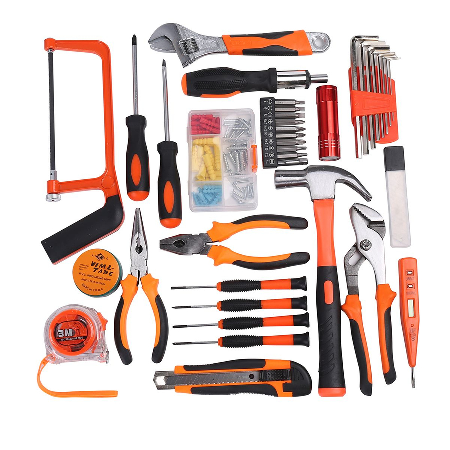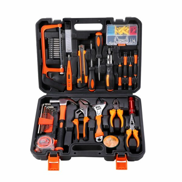 -102 Piece Multi Tool Box this tool set includes adjustable wrench, screwdriver, screwdriver bit set, pliers, ratchet screwdriver set, allen wrench set , a hammer, a strong fiber handle, a utility knife, etc.