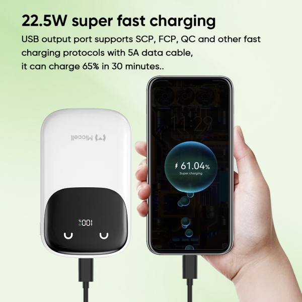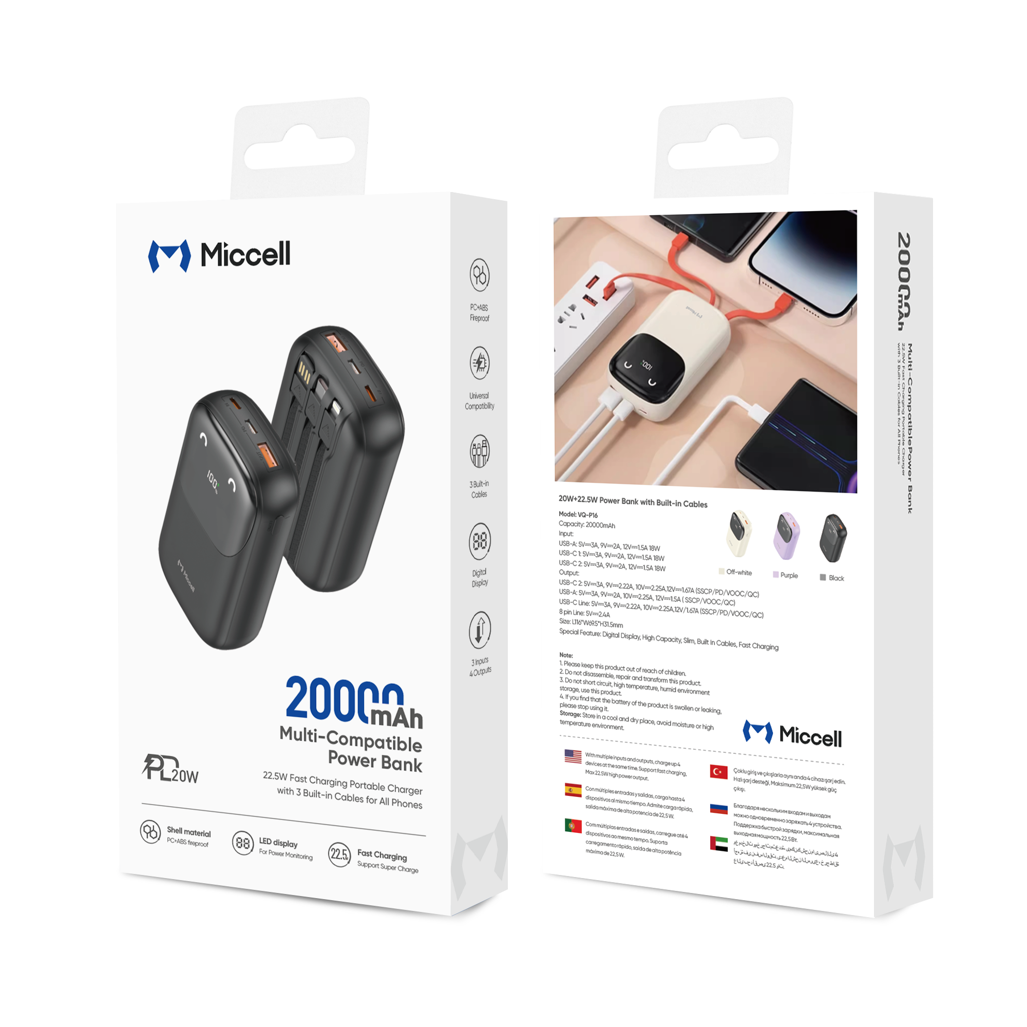 The Miccell 20000mAh Multi-Compatible Fast Charging Power Bank is your all-in-one solution for staying powered up throughout the day. With built-in charging cables, dual fast charging outputs (20W + 22.5W), and broad compatibility, it offers reliable, high-speed charging for all your devices—without the need to carry extra cables.